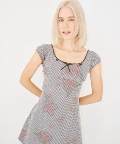 Mini dress featuring a fun floral print overtop a black and white gingham pattern with delicate black trim details, cap sleeves, and a bow at front. Closure at side with a smocked back panel and a tie at back for size versatility. This dress runs small. We recommend sizing up!