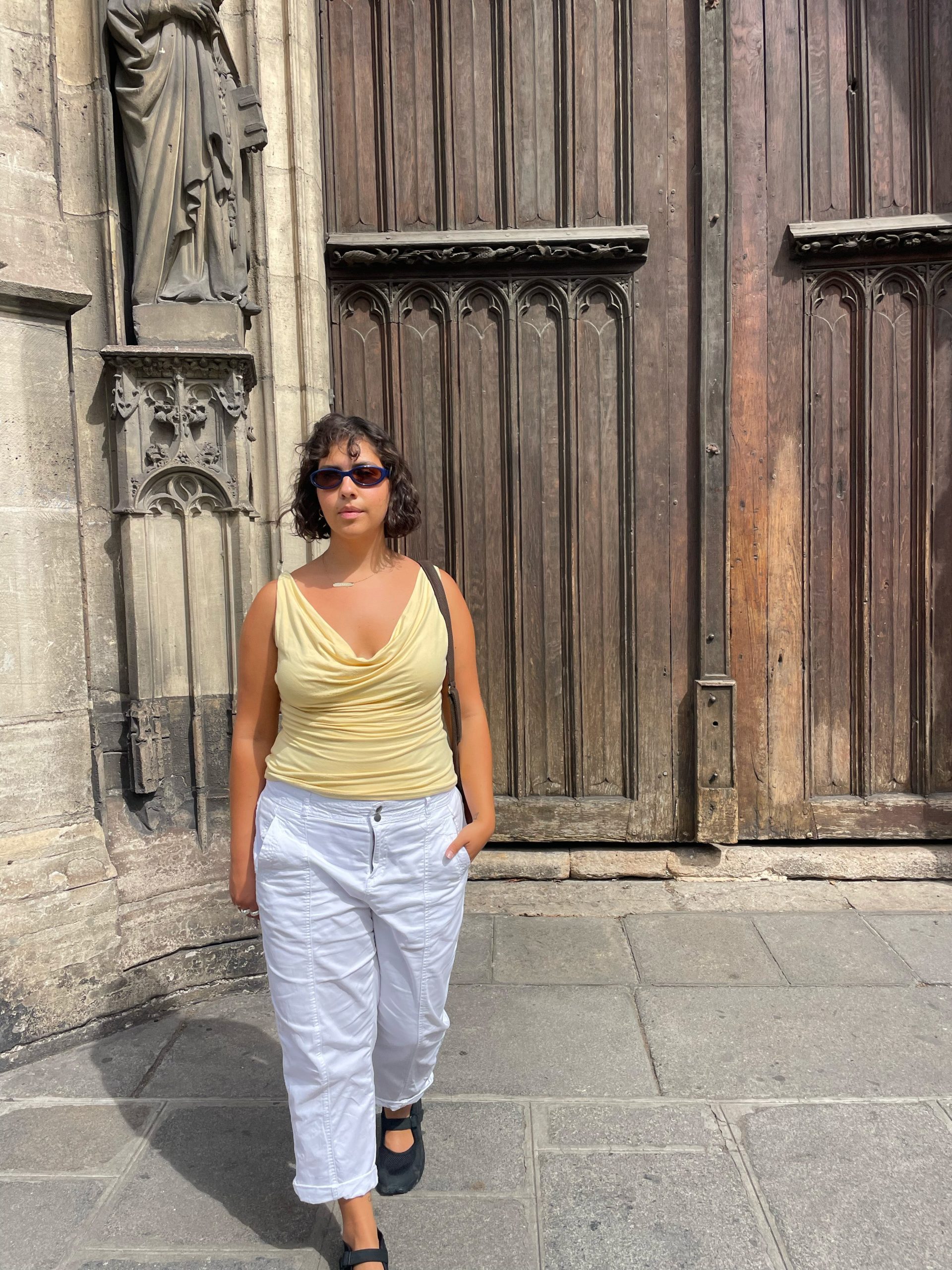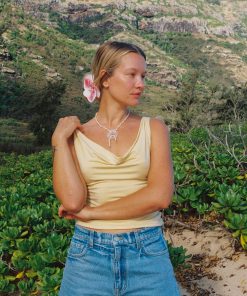 Knit top with a cowl neckline featured in a butter yellow. This top cinches at the waist for a fitted look. This stretchy knit fabric is comfortable and accounts for about 2-3in of stretch all around.