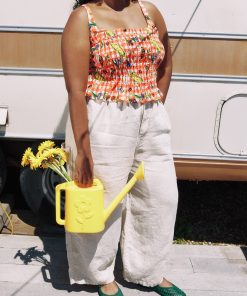 Wide leg baggy pant made out of a 100% linen with a neon green drawstring at the waist for a versatile fit. Features plenty of large pockets.