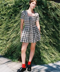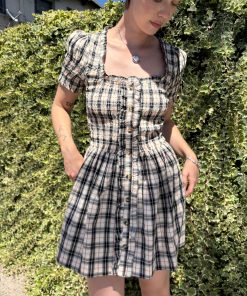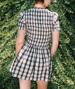 Mini dress with full button front featuring a square neckline and a shirred bodice for ultimate comfort. This dress is made of 100% cotton in a fun butter check print.