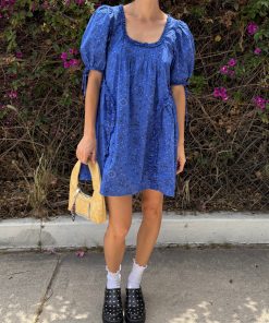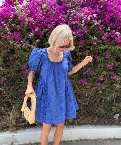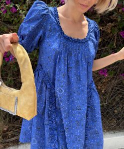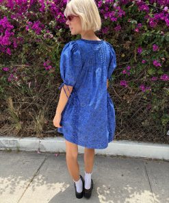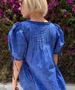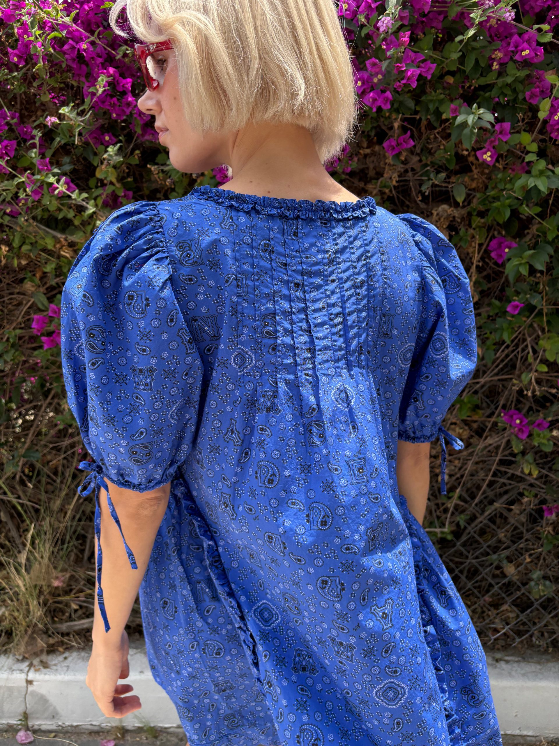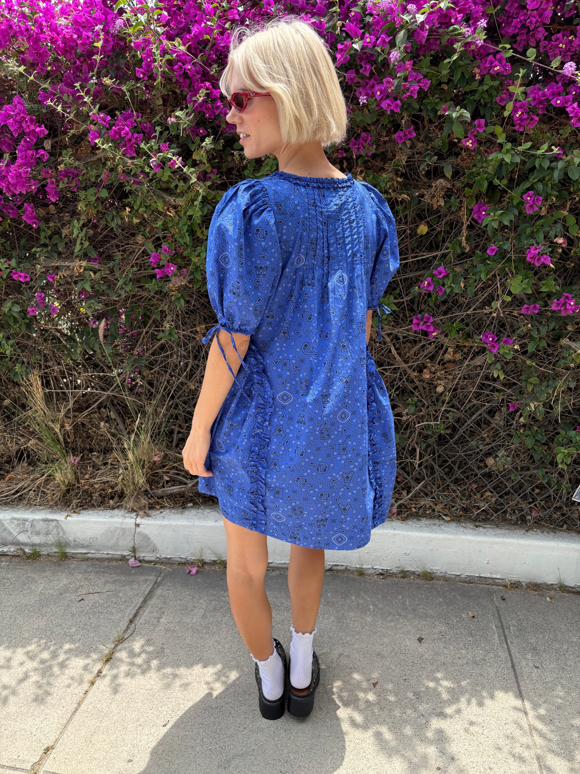 The Meri Mini Dress is a babydoll dress silhouette featuring ruffles, puff sleeves, and a gorgeous blue paisley print in an organic cotton fabric.