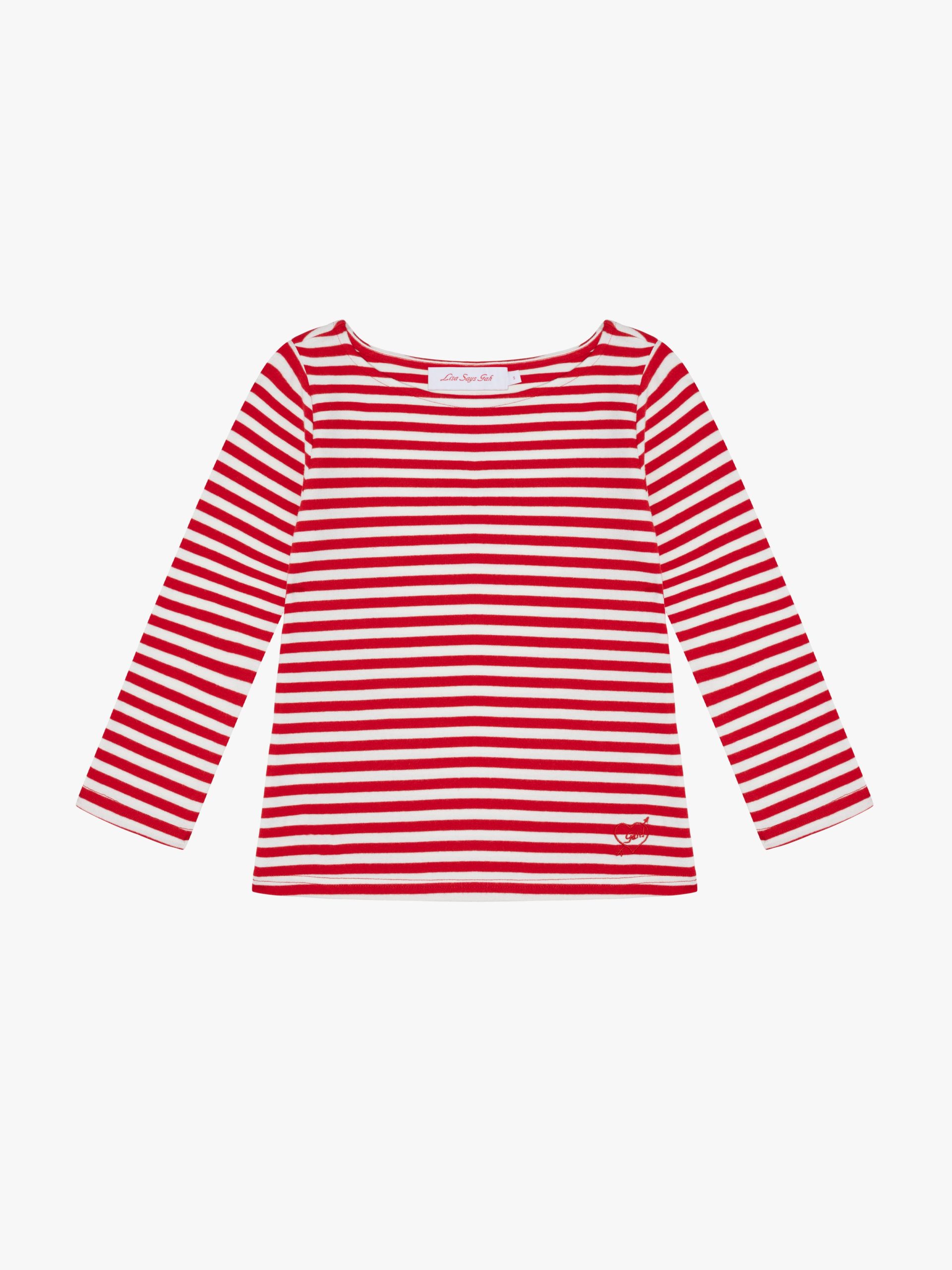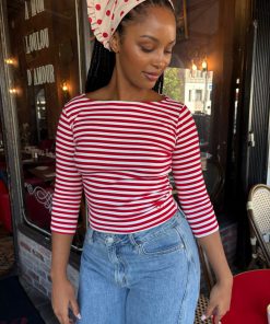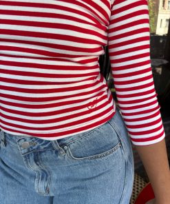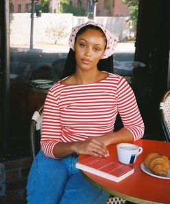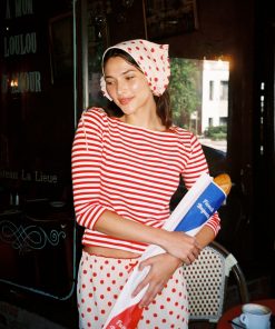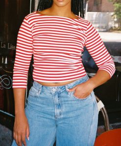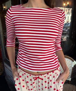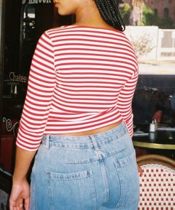 Introducing Le Petit Dot: Dots, stripes, and silhouettes made for the season in-between. The Nia Top in our signature Scarlett Stripe print is a true staple for any wardrobe. This cotton blend 3/4 sleeve tee has a boxy, cropped silhouette. Made to have a vintage-feel. Featuring our signature Gah! embroidery at the bottom hem.