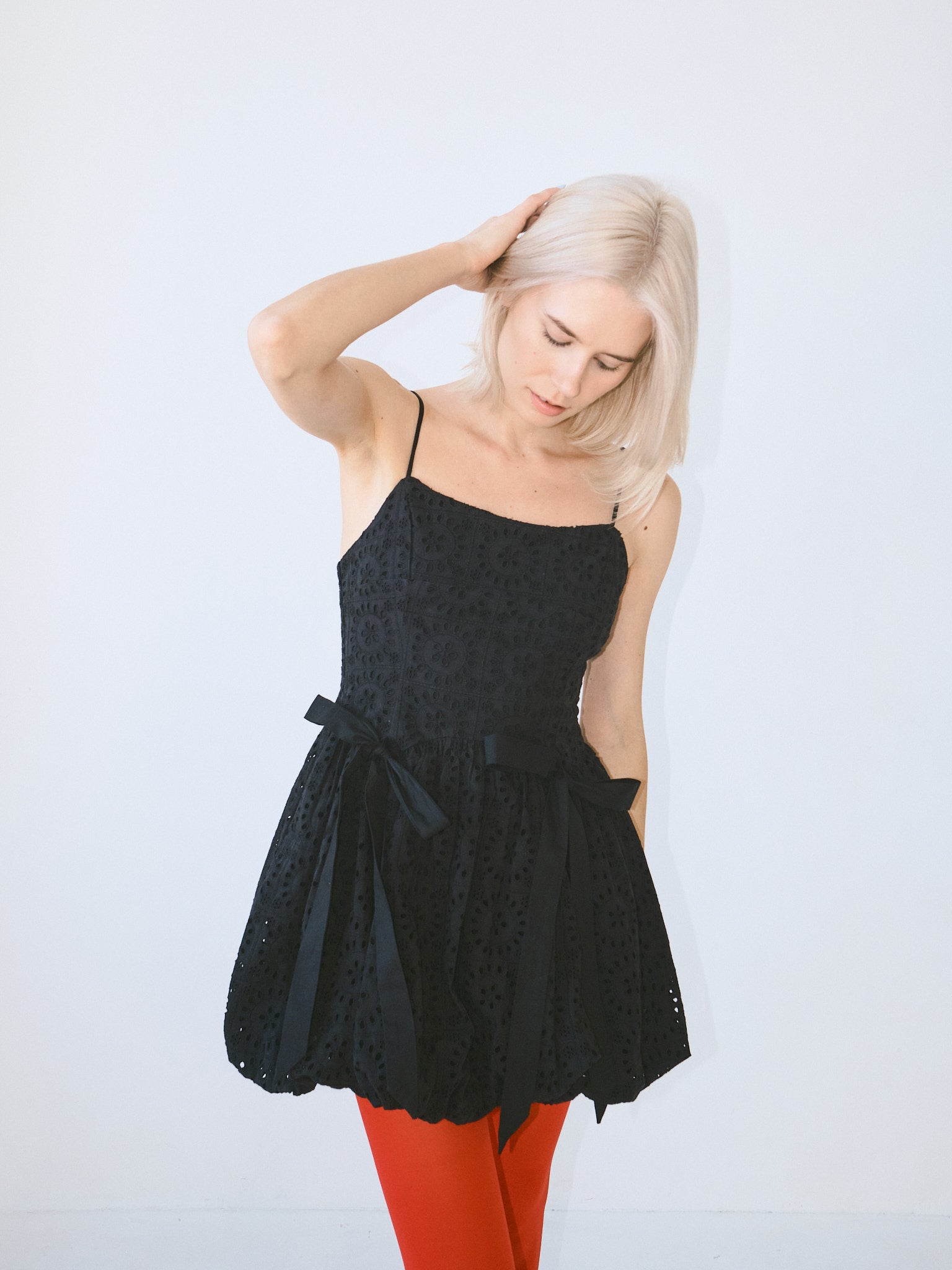 The Penelope apron dress is a black broderie mini dress featuring a corset style bodice with waist seam details and bows that gather into a fuller skirt.