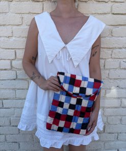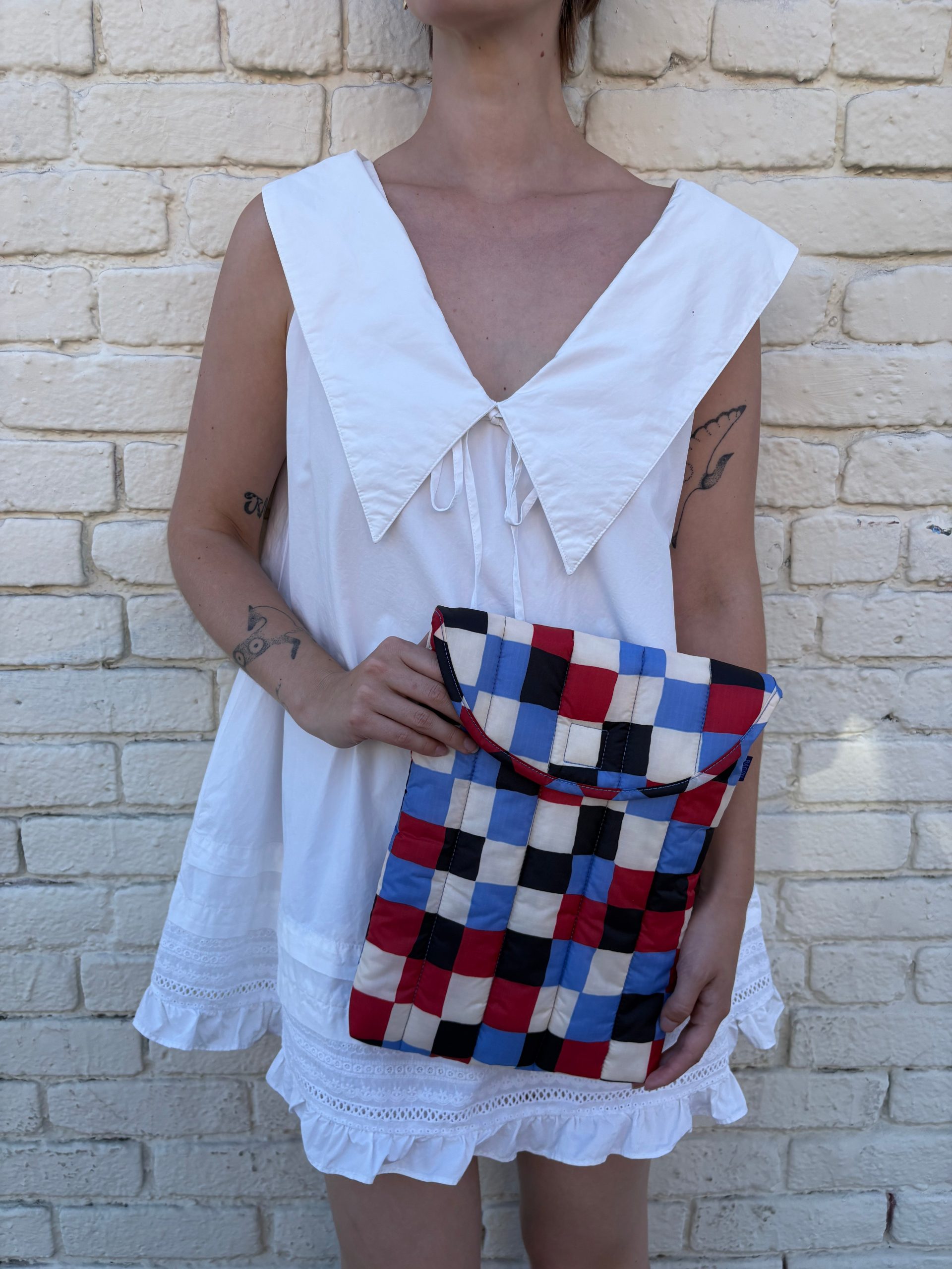 Puffy laptop sleeve with a velcro closure, featuring a playful check print, quilted with padding for extra protection.